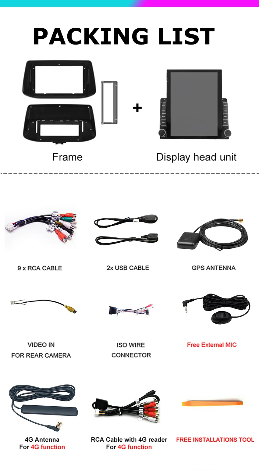 يتضمن المنتج وحدة عرض الرأس والإطار والملحقات. إذا لم يكن الطراز يحتوي على وظيفة 4G، فإن الملحقات لا تتضمن هوائي 4G وكابل RCA مع قارئ 4G.